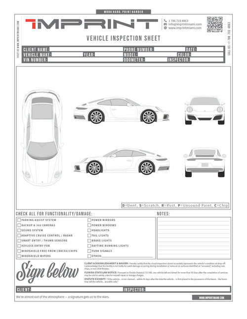 A clean, professional car inspection sheet template built for wrap shops, detailers, body shops, and automotive businesses that need a sharper intake and inspection process.